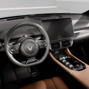 Điểm độc đáo của VF 8 phải kể đến không gian khoang lái với cụm vô lăng và bảng taplo hiện đại. Cụm đồng hồ thông tin lái được thay thế bằng màn hình HUD và tích hợp cùng với màn hình giải trí trung tâm kích thước 15,6 inch, đồng thời tối giản các nút bấm vật lý giúp người dùng dễ dàng theo dõi thông tinh hành trình và điều chỉnh các tính năng theo nhu cầu.